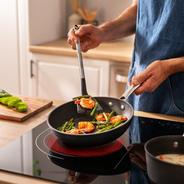 Der vernietete, halb-professionelle Griff aus Edelstahl liegt sicher und stabil in der Hand. Für den Familien- oder Alltagsgebrauch konzipiert, sind die Pfannen kompatibel mit Induktionskochfeldern von 143 mm, 182 mm und 224 mm Durchmesser – für maximale Flexibilität je nach Größe.