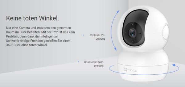 Die Ezviz TY2 ist in den Farben Weiß und Schwarz erhältlich, sodass sie sich harmonisch in jede Umgebung einfügt. Mit ihrer einstellbaren Neigung können Sie den Überwachungsbereich individuell anpassen.