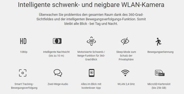 Die Kamera bietet eine Tag- und Nachtsichtfunktion, die eine 24-Stunden-Überwachung ermöglicht. Sie können sie über Wi-Fi mit Ihrem Netzwerk verbinden, was eine flexible und einfache Installation ermöglicht.