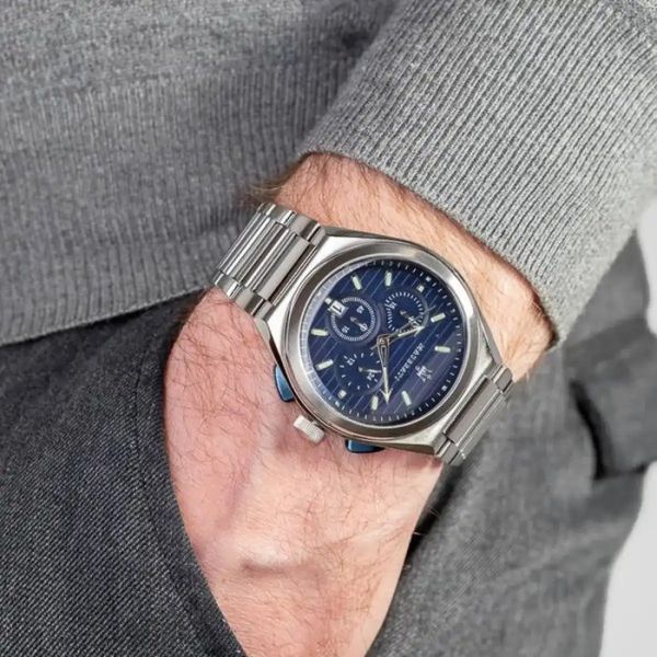 Angetrieben von einem zuverlässigen Quarzwerk, bietet diese Uhr eine außergewöhnliche Genauigkeit. Ihr integrierter Chronograph ermöglicht präzise Zeitmessungen – ganz im Zeichen der Maserati-Dynamik. Die Datumsanzeige bei 4 Uhr fügt eine praktische Note hinzu, ohne das harmonische Design zu stören.