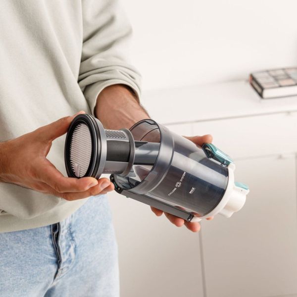 Das fortschrittliche Zyklon-System mit dreifacher Filterung kombiniert einen Zyklonfilter, einen HEPA-Filter und einen Mesh-Filter. Diese Filterung erfasst feine Partikel zuverlässig und trägt zur Verbesserung der Raumluftqualität bei. Alle Filter sind herausnehmbar und waschbar, was eine einfache Wartung und dauerhaft hohe Leistung gewährleistet.