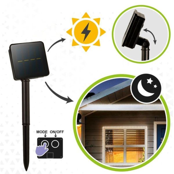 Le panneau solaire fourni est monté sur piquet, idéal pour être planté dans le gazon ou le sol meuble. Il alimente vos LED sans effort : la journée, la lumière naturelle recharge la batterie intégrée ; le soir venu, la bande s'allume automatiquement selon le mode choisi. Avec ses 8 fonctions d'éclairage, un bouton de sélection et un bouton ON/OFF, vous pouvez personnaliser l'ambiance selon vos envies.