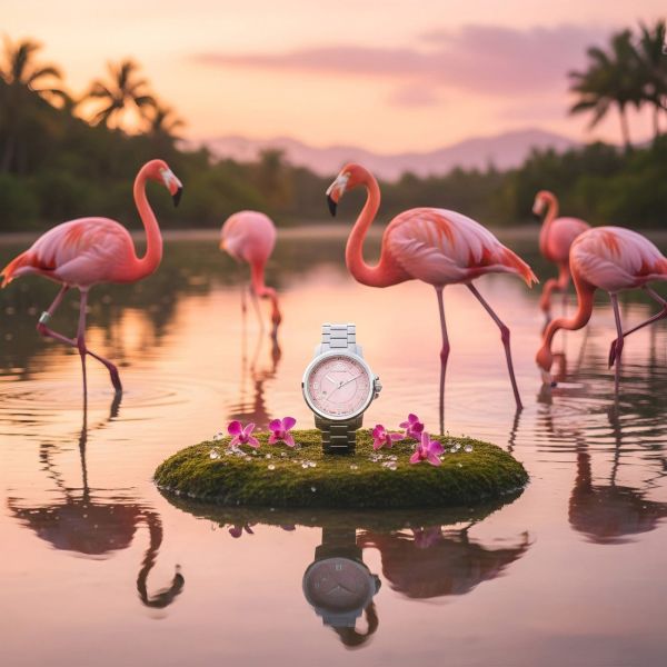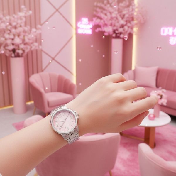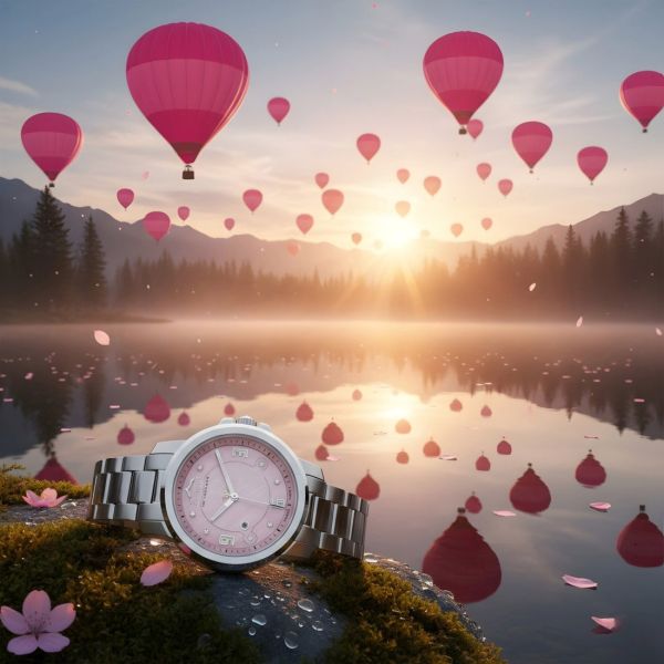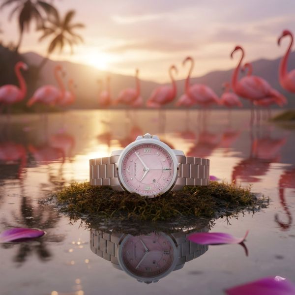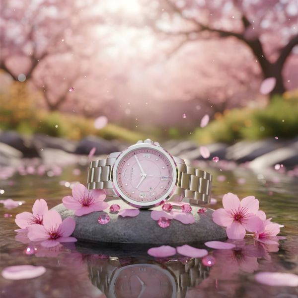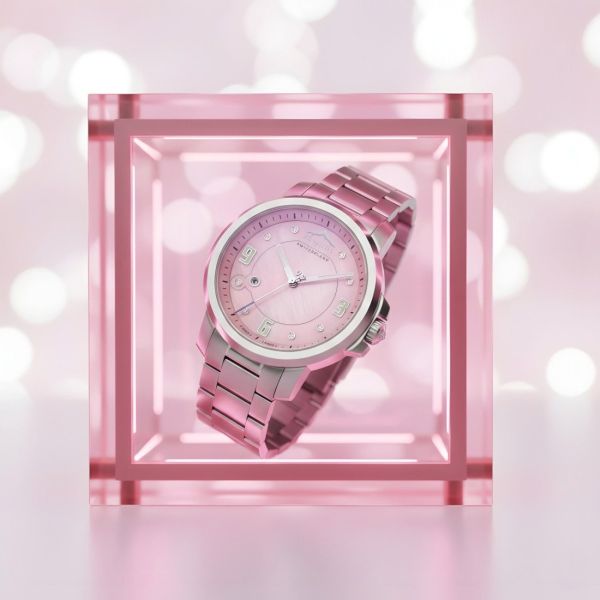 Son cadran en nacre rose reflète des nuances qui changent avec la lumière — comme les émotions, comme la vie.
