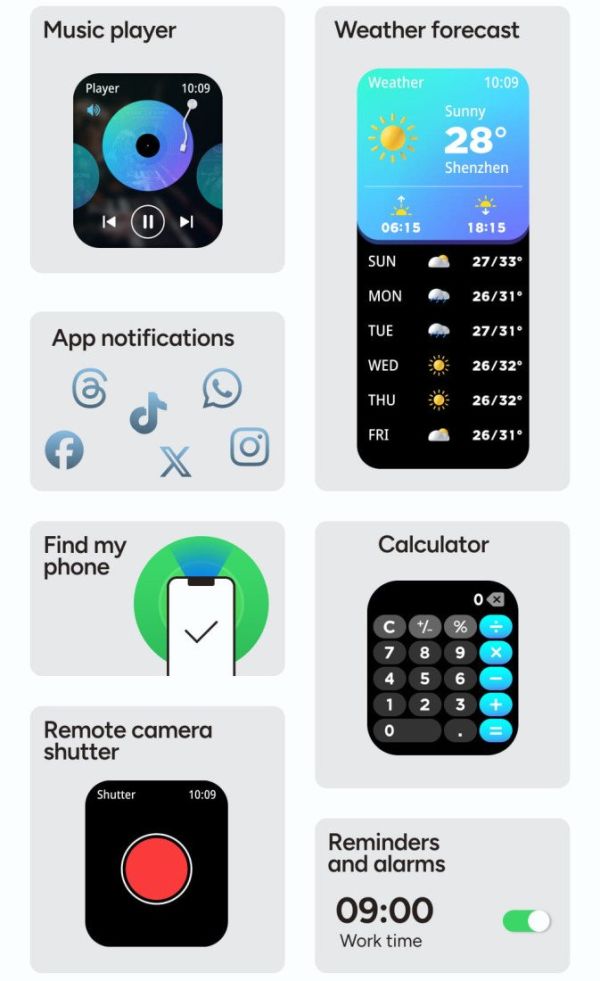| Fonctions | Appels, notifications, suivi santé, modes sportifs |
